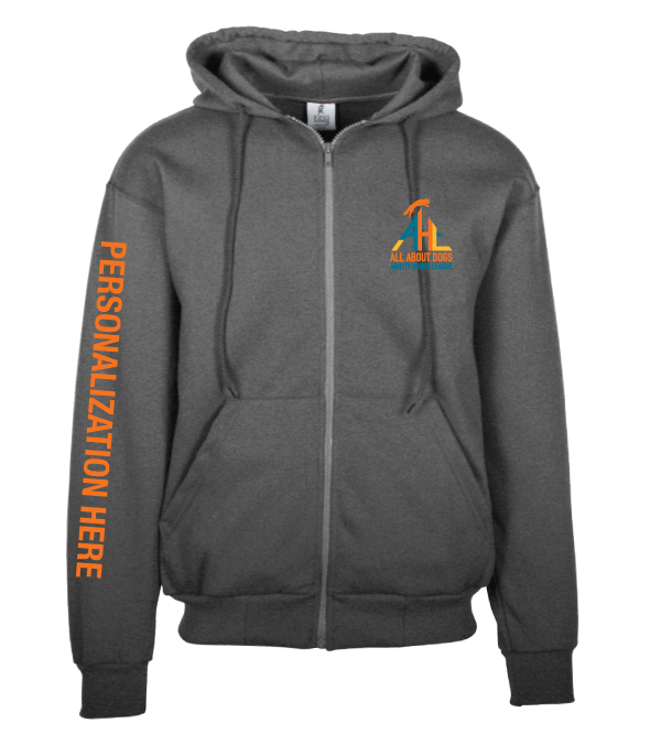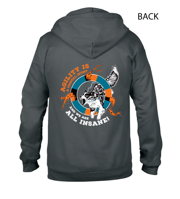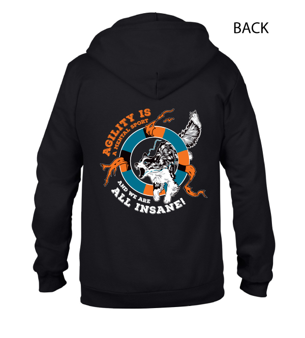 The House League T-shirts will include the “Agility Is A Mental Sport And We Are All Insane!” logo in large format in a circular design. The logo will be printed on the BACK of the sweatshirt. On the Left Sleeve will be the AHL Logo, done in embroidery.