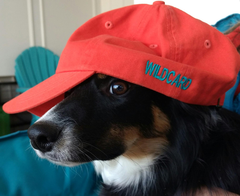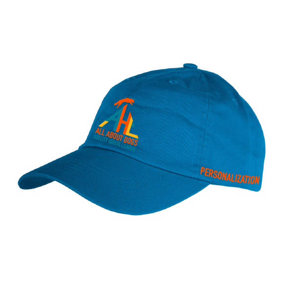 You can customize your ball cap on the LEFT SIDE, and include any one line of text, like your dog’s name, and it will be embroidered onto the hat.